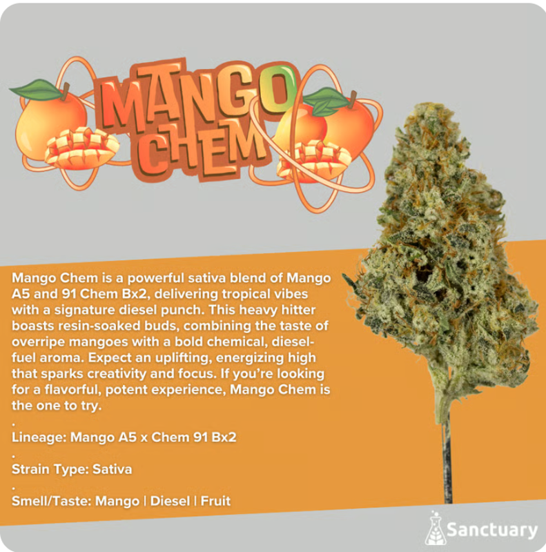 Mango Chem is a powerful sativa blend of Mango A5 and 91 Chem Bx2, delivering tropical vibes with a signature diesel punch. This heavy hitter boasts resin-soaked buds, combining the taste of overripe mangoes with a bold chemical, diesel-fuel aroma. Expect an uplifting, energizing high that sparks creativity and focus. If you’re looking for a flavorful, potent experience, Mango Chem is the one to try.